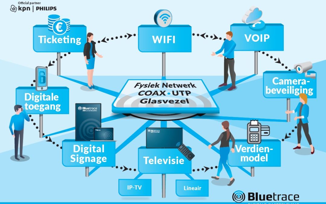 Onze oplossingen zijn gebouwd op een solide fysiek netwerk (COAX, UTP en glasvezel) en vormen de basis voor toepassingen zoals wifi, VoIP, televisie, digitale toegang, ticketing, camerabeveiliging, digital signage en betaaloplossingen. Alles is naadloos met elkaar verbonden en centraal beheersbaar.
